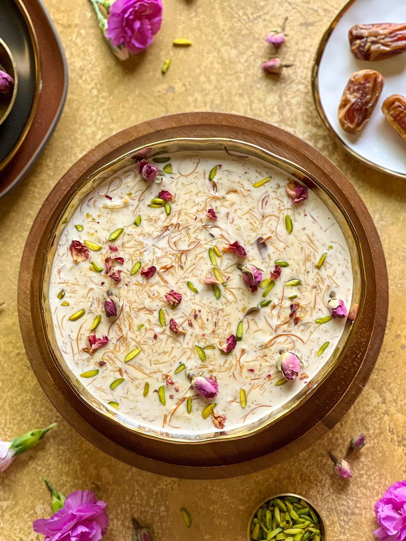 In Pakistan, India and Bangladesh, the excitement of the celebrations often reaches its highest peak the night before Eid, known as Chand Raat (the Night of the Moon). Markets stay open until the early hours of the morning as women crowd around henna stalls to have intricate Mehndi designs applied to their hands. On the day of Eid, the star of the show is Sheer Khurma, a creamy vermicelli pudding cooked with milk, dates and nuts. It’s a staple in every household, and it is tradition to offer a bowl to any guest who walks through the door.